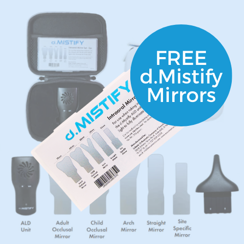 Any of the 5 d.MISTIFY intraoral mirrors provided can be attached to the ALD Unit, and in addition, the d.Mistify ALD Nozzle can be connected to the ALD unit to provide an airstream that is powerful enough to clear saliva and debris from any targeted area.